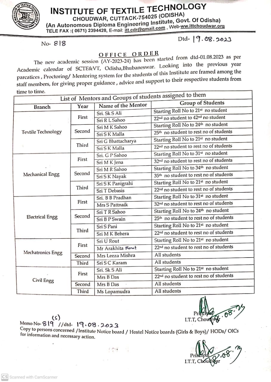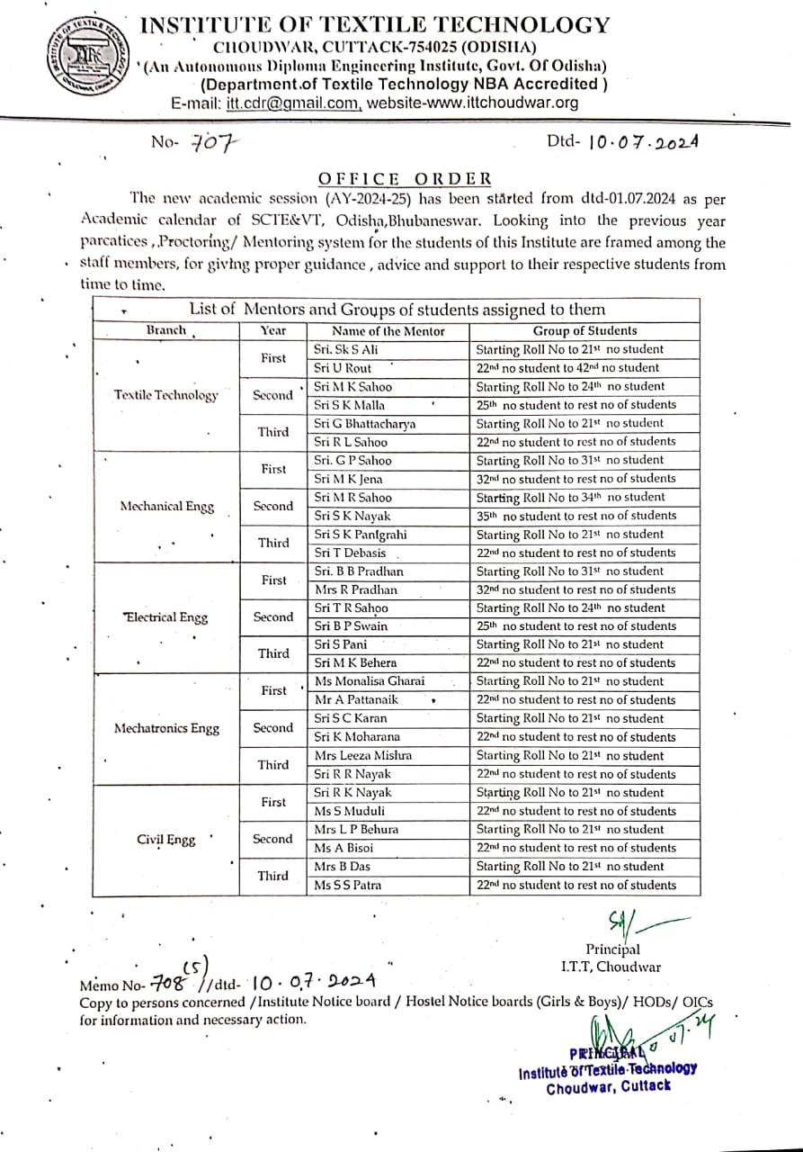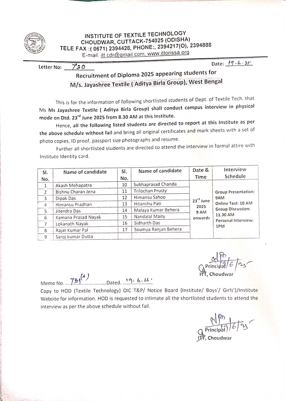 Institute of Textile Technology, Choudwar was established by Govt. of Odisha in 1983, was offering only Diploma Course in Textile Technology